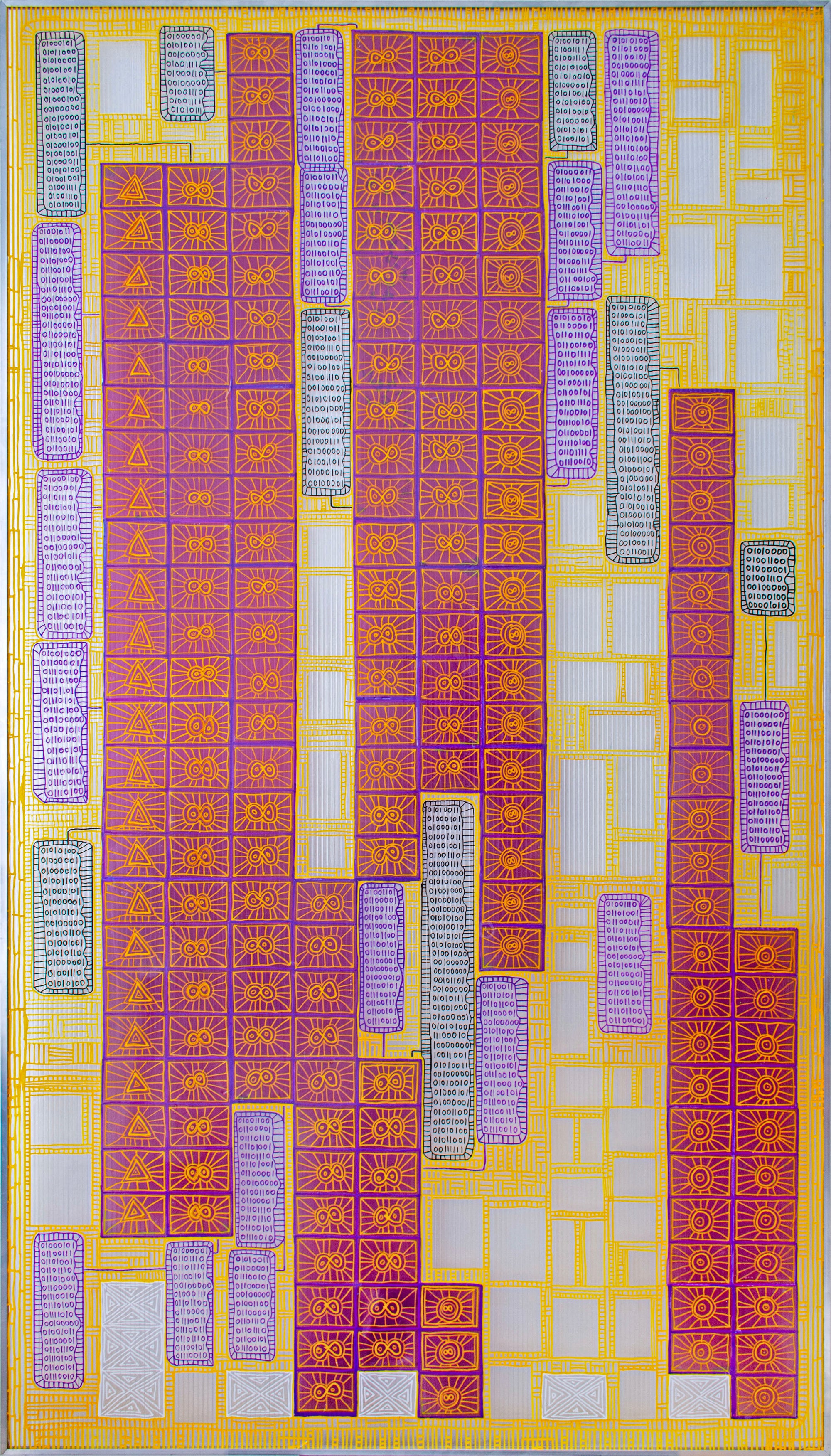 Permanent marker on coloured foil on twin-wall sheets, sealed with epoxy resin, mounted in aluminium frame